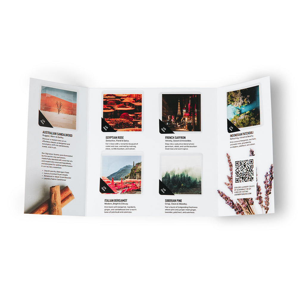 Not sure which scent to make your signature? Now you can experience our core collection of 6-scents before going all-in with our Scent Brochure. Featuring an innovative lift and sniff design, this unlocks the Laundry Sauce experience so you can decide which fragrance to try first (but it won't be your last).